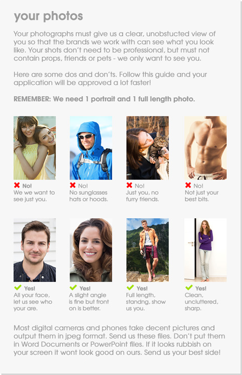 Please supply us with at least {{model.minPhotos}} good {{'photo'|pluralize:model.minPhotos}} of yourself. We are after 1 head shot and 1 full length photograph. Choose the best photos you have and make sure it is only you in them.